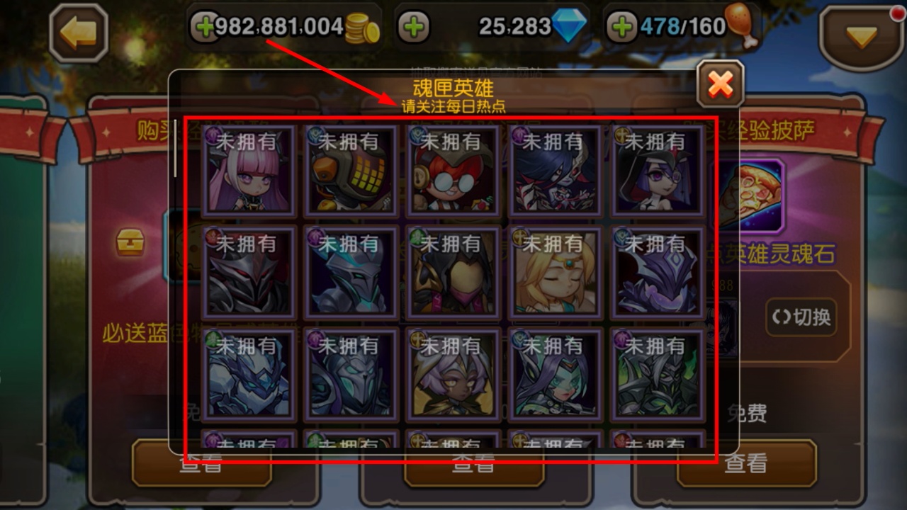 2、进入魂匣英雄界面可查看未拥有的英雄列表,关注每日热点获取稀有英雄,丰富阵容选择。
