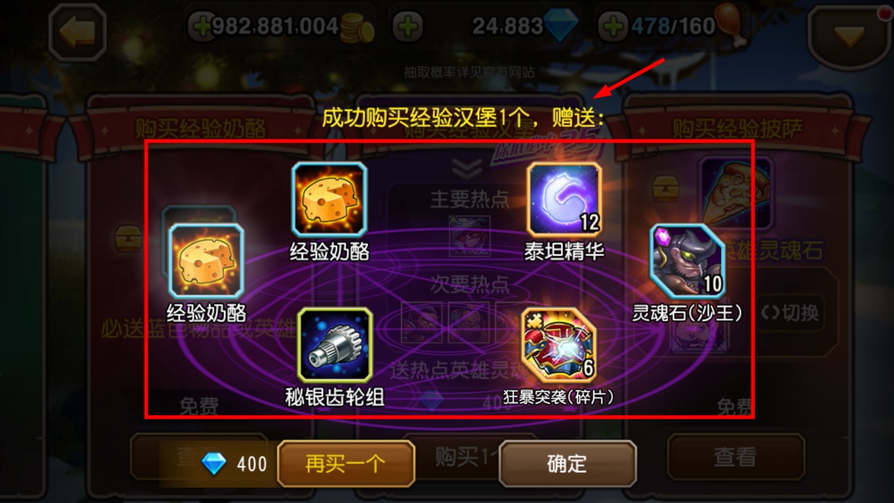 4、成功购买经验汉堡将获得经验奶酪、泰坦精华等物品,助力英雄养成与装备强化。