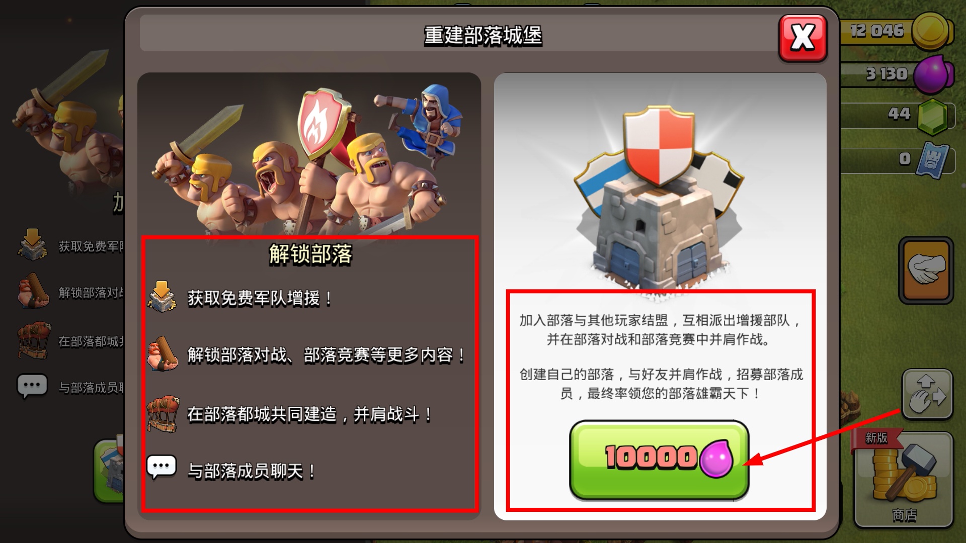 2、消耗【10000】【紫水】重建部落城堡,解锁部落功能与其他玩家结盟,互相派出增援部队作战。