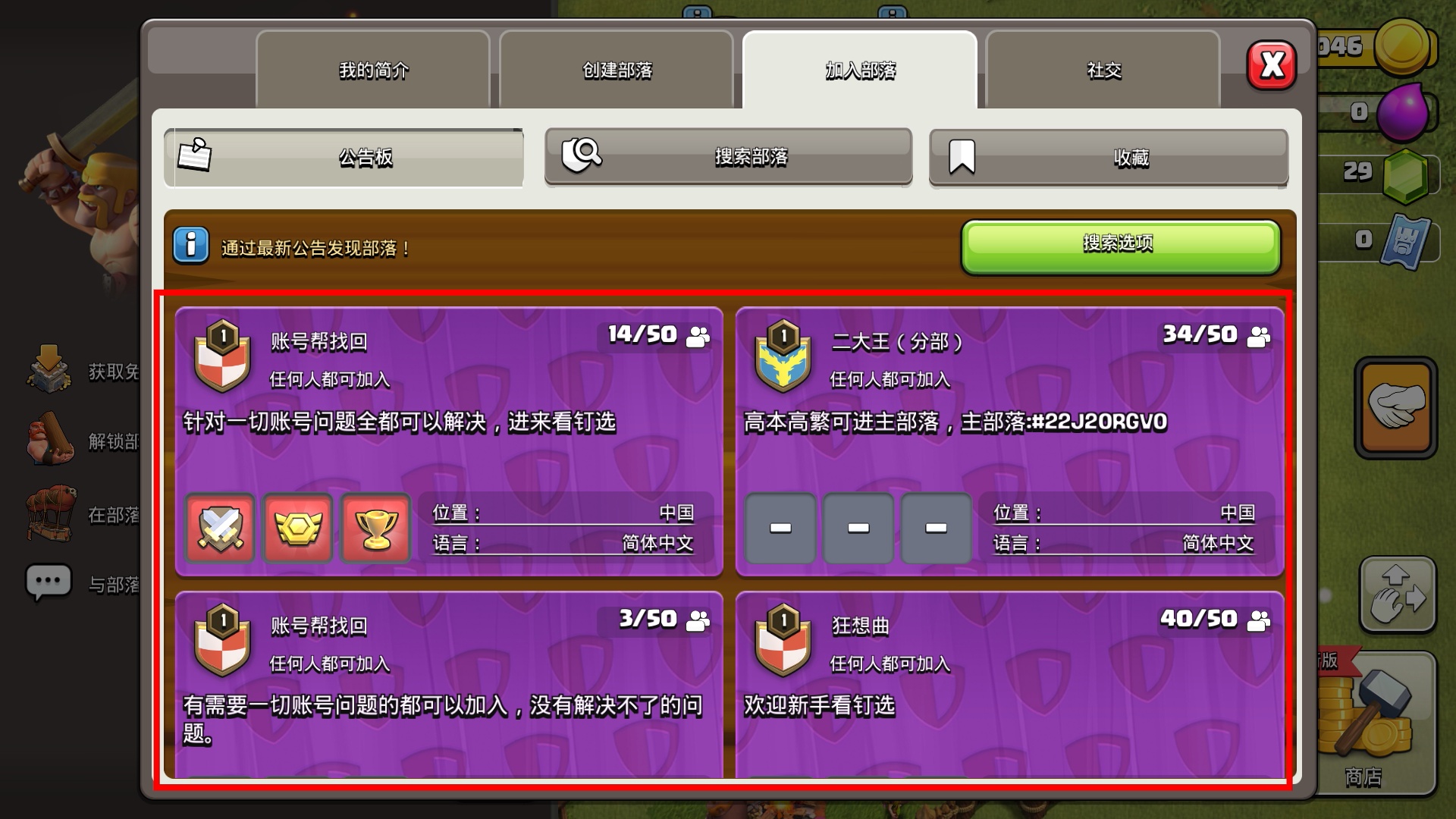 3、在部落搜索界面查看【账号帮找回】【二大王(分部)】等部落,选择人数充足且符合需求的部落。