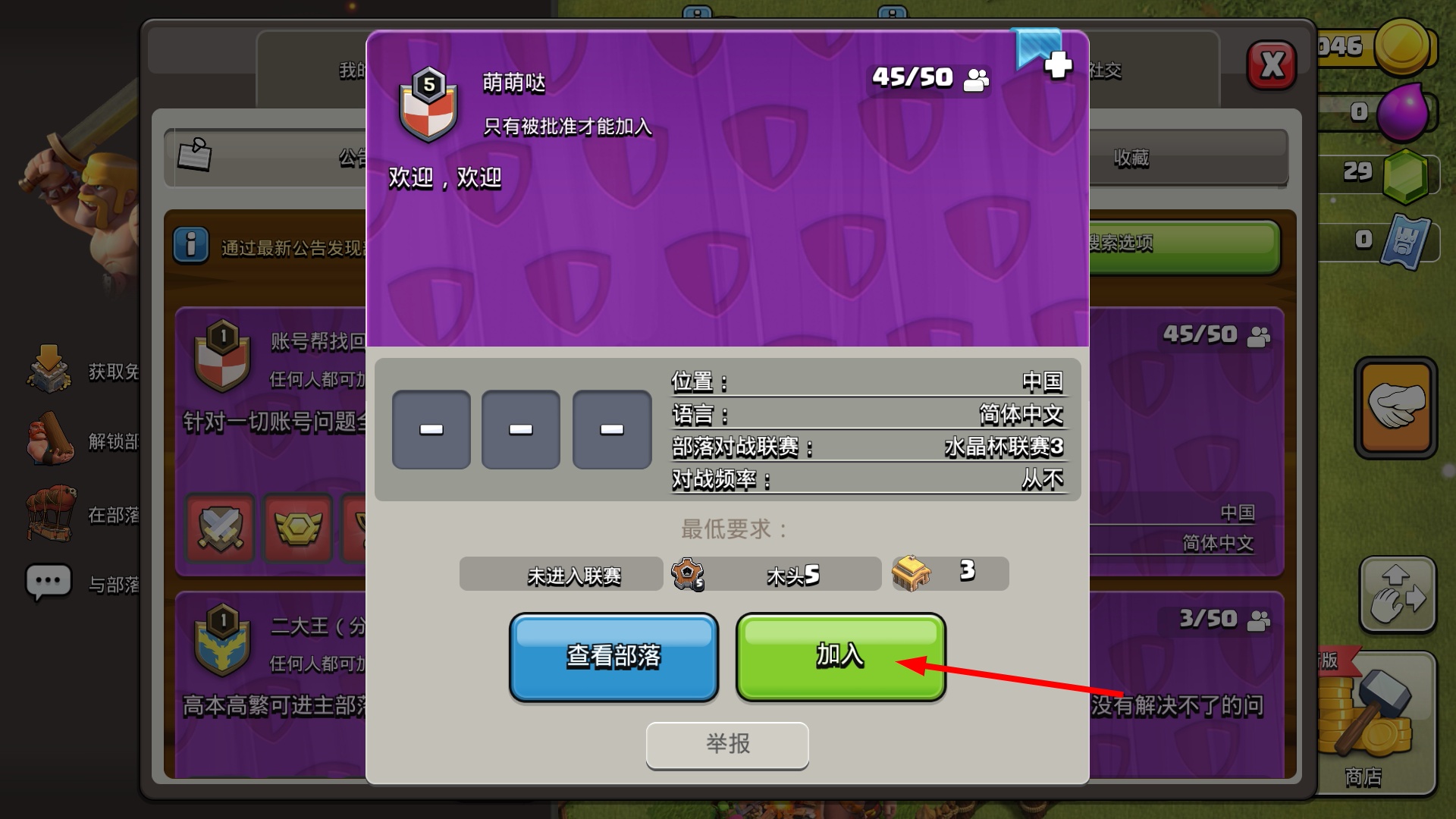 1、点击【立即加入】按钮可获取免费军队增援,解锁部落对战与竞赛等内容,还能和成员聊天共同战斗。