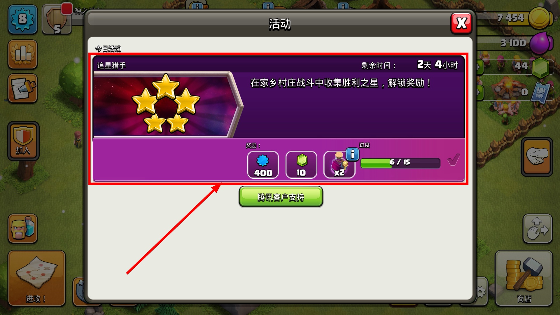 1、参与【追星猎手】活动,在家乡村庄战斗收集胜利之星,解锁【400】-【10】-【2】等奖励,进度达【15】可领全部。