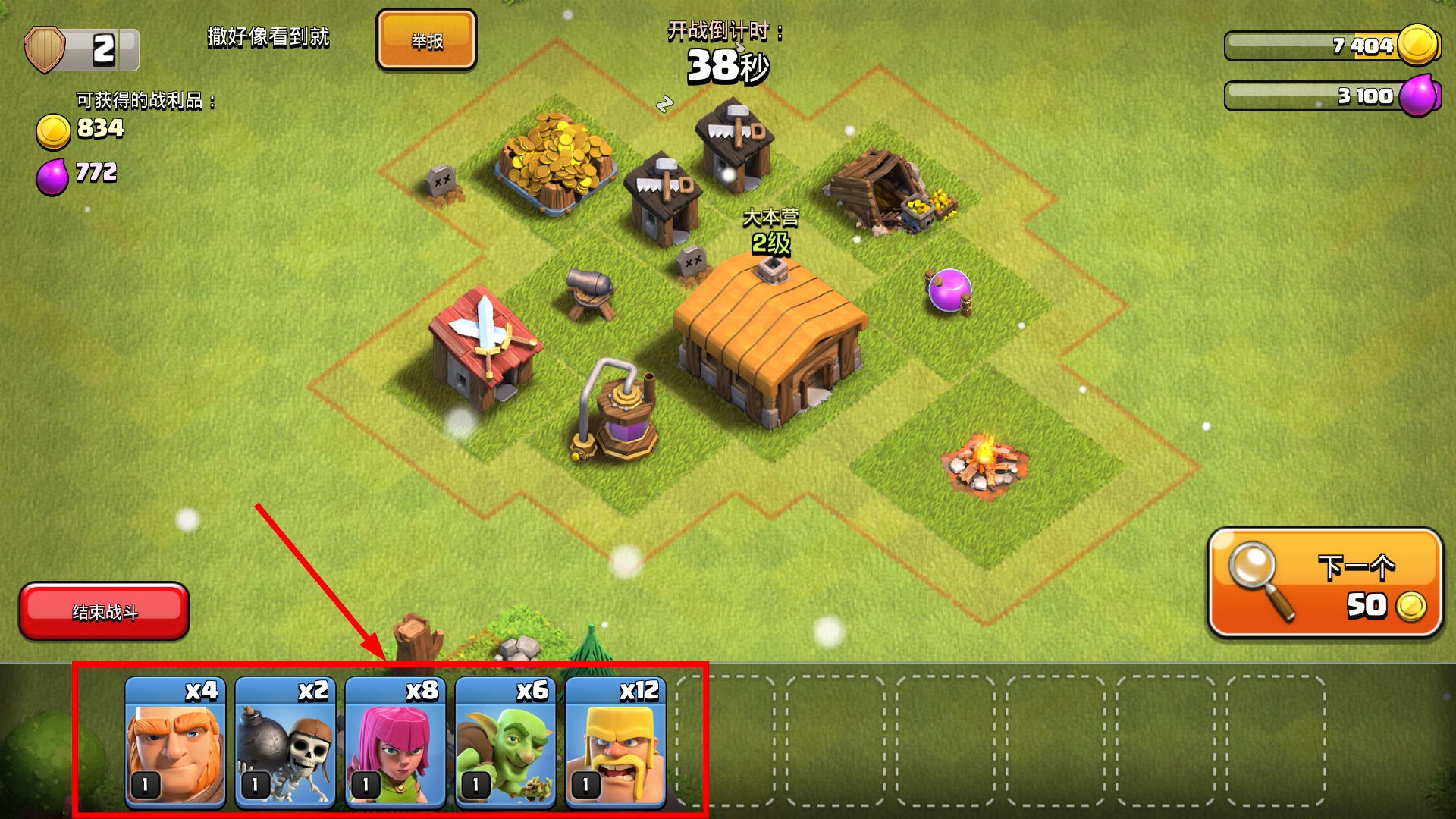 3、开战前搭配【野蛮人】-【弓箭手】-【哥布林】等兵种,利用倒计时38秒调整阵容,提升战斗胜率。