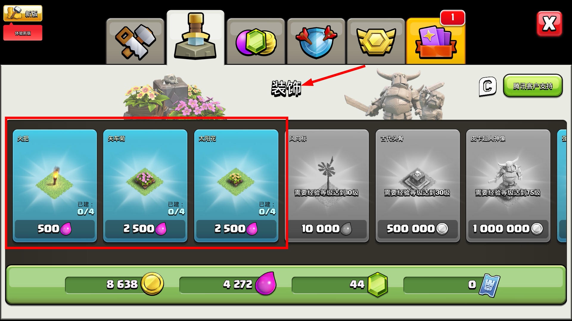 3、用【圣水】购买【火把】【矢车菊】等装饰,美化基地环境且提升基地整体评分与视觉体验。