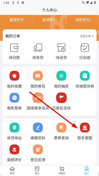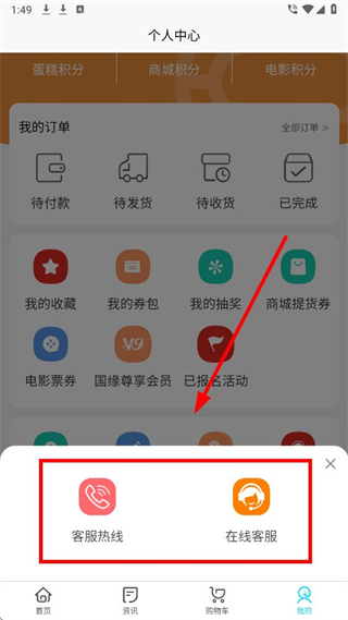 2、进入个人中心页面后,找到联系客服选项并点击,弹出客服方式选择的弹窗。