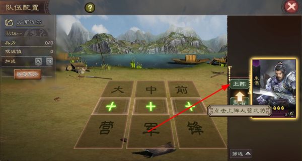 3、打开队伍配置界面,点击上阵按钮安排武将进入阵容,搭配合适的队伍组合,提升战斗时的作战能力。