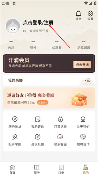 1、在汗滴首页,点击底部的我的选项,进入个人页面。