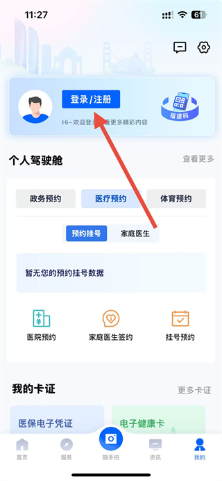 2、在我的个人页面,点击登录注册按钮,进入登录页面。