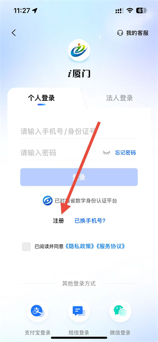 3、在i厦门的注册页面,点击下方注册选项,进入注册页面。