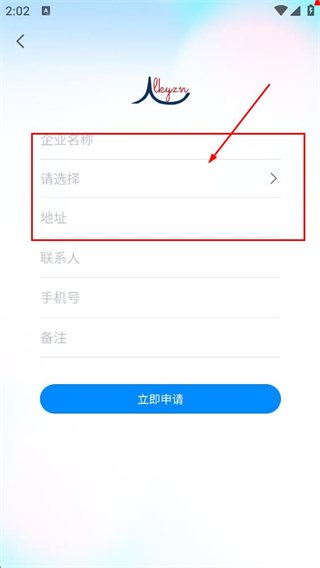 2、在申请页,选择企业名称对应的请选择选项,并填写地址。