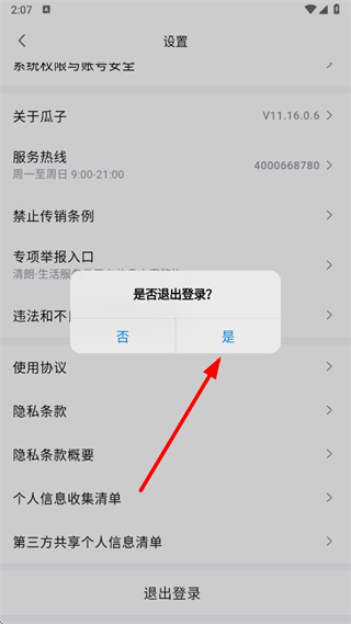 4、在确认弹窗中,选择是选项,即可完成账号退出登录操作。