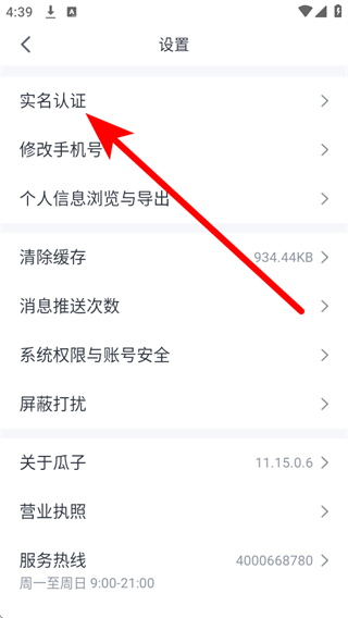 3、在设置界面里,点击实名认证选项,进入实名认证页面。