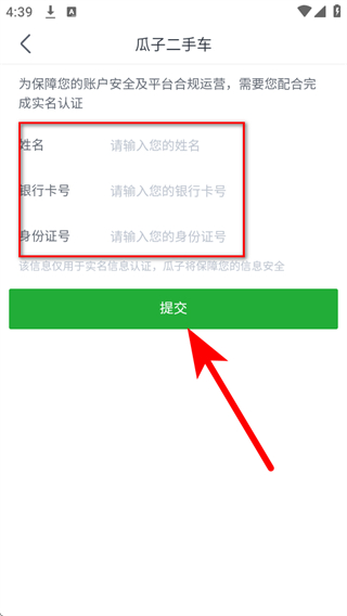 4、在实名认证页面,依次输入姓名、银行卡号、身份证号,输入完成后点击提交按钮,即可完成实名认证。