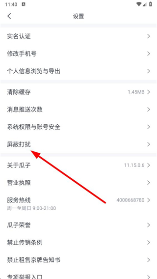 3、在设置界面中,找到屏蔽打扰选项并点击,进入开通免电话打扰页面。