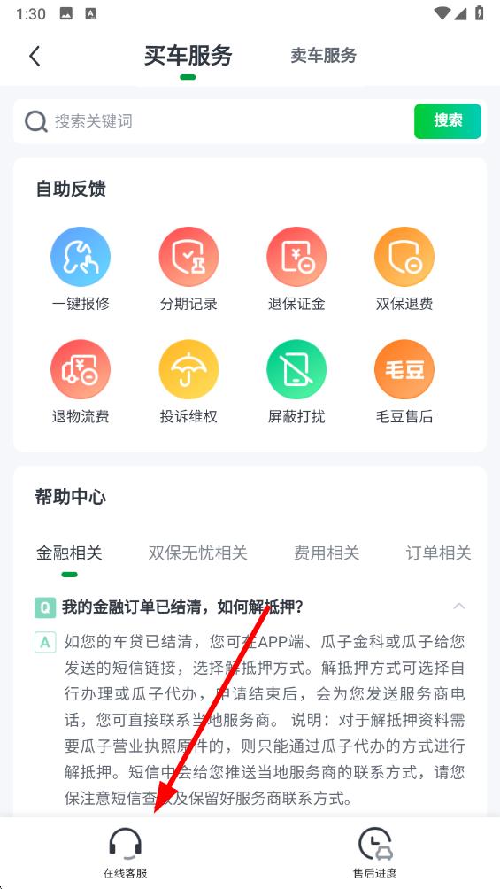 3、在页面底部找到在线客服选项并点击,进入在线客服对话窗口,在窗口内输入想要咨询的问题,即可与瓜子二手车客服取得联系。
