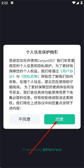 1、在个人信息保护指引弹窗中点击同意按钮,进入应用引导页面。