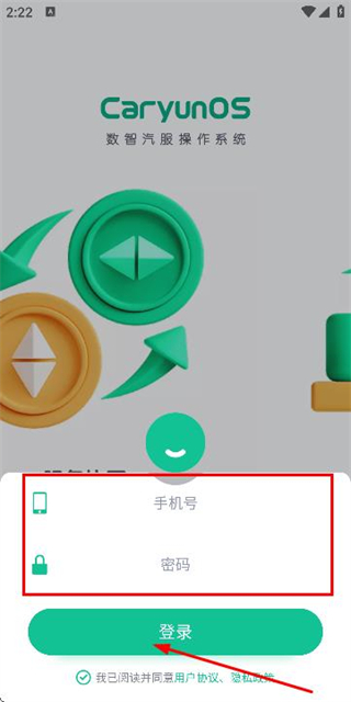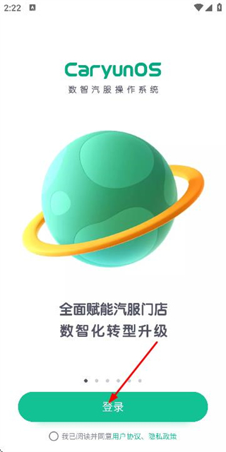 2、在应用引导页面勾选协议后,点击登录按钮进入登录页面。