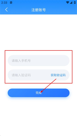 4、填写手机号,获取并填写请输入验证码后,点击完成。