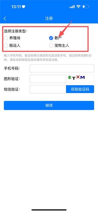 2、在注册页,选择散户作为注册类型,即可进行下一步的操作。