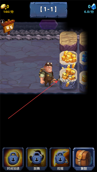 1、在1-1关卡中,点击矿石堆,操控矿工开采资源,积累金币与钻石。