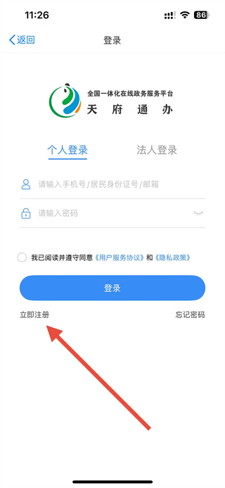 3、在登录界面,点击左下角的立即注册选项,进入个人注册页面。