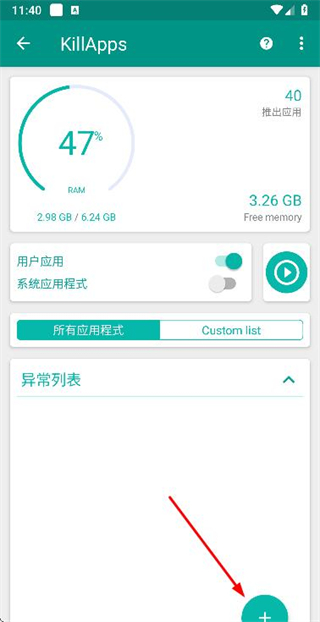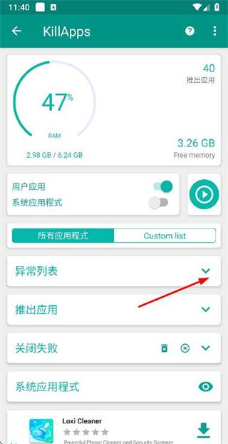 1、在KillApps页面点击异常列表右侧的下拉箭头,展开异常列表区域。