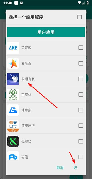 3、在选择应用程序窗口中勾选目标应用后,点击好按钮完成添加操作。