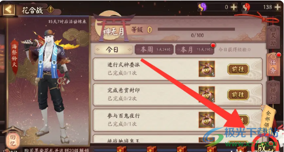 3、花合战任务:任务所获得的经验可增加花合战等级,当等级达标将得到该阶级的奖励。
