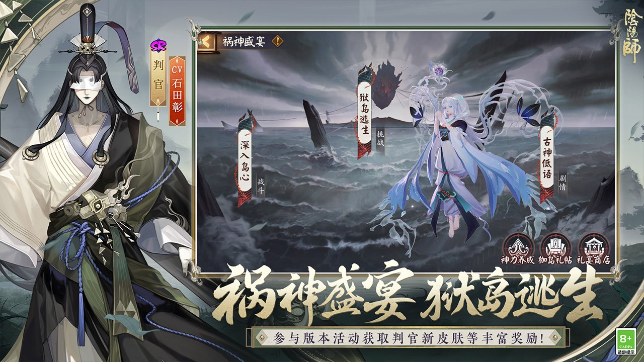 版本活动:大型活动「祸神盛宴」开启!参与活动还可获取随机SP/SSR式神召唤券、判官新皮肤·逸墨沾衣、御行达摩等丰厚奖励!